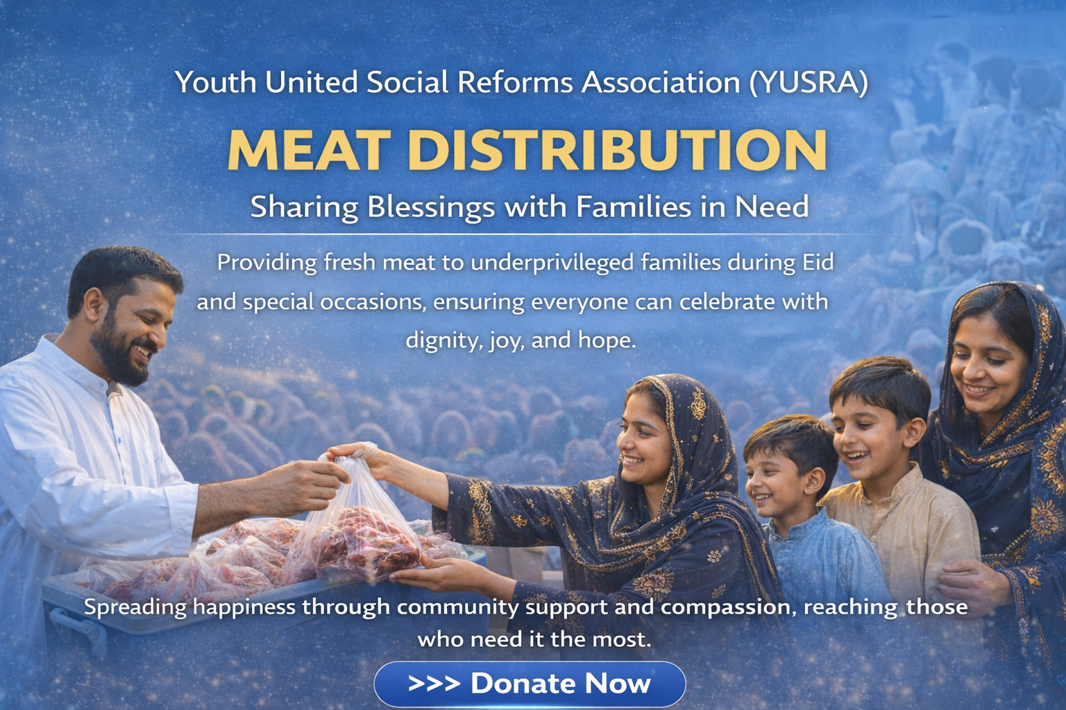 Meat Distribution Program is a welfare initiative by Youth United Social Reforms Association (YUSRA) aimed at providing fresh and hygienic meat to underprivileged families who cannot afford nutritious food regularly. During special occasions such as Eid-ul-Adha and other relief drives, YUSRA ensures that deserving families receive their share of meat so they can enjoy healthy meals with dignity.